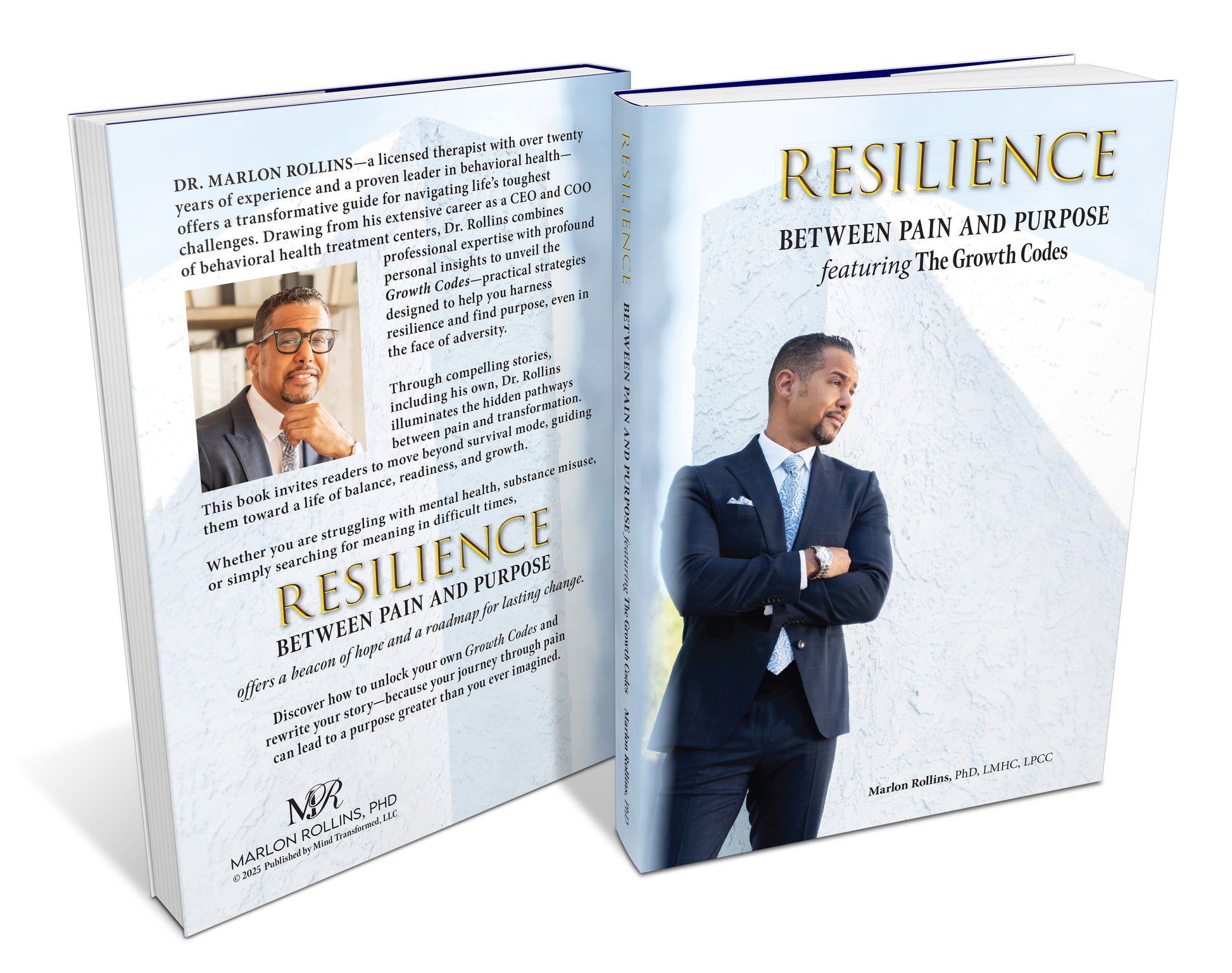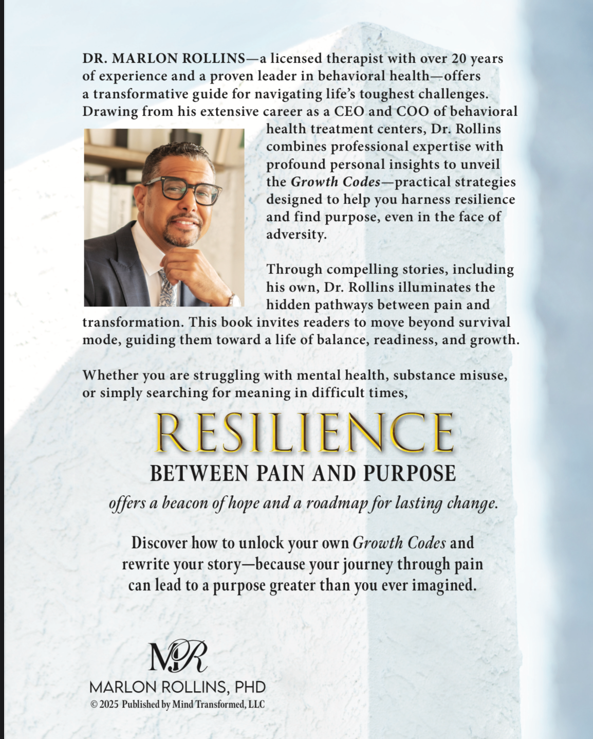 In *Resilience: Between Pain and Purpose*, Dr. Marlon Rollins—a nationally recognized mental health expert and suicide prevention advocate—invites you into a deeply personal and professionally grounded journey through adversity, healing, and transformation. This book introduces the Growth Codes, a framework designed to help individuals move from survival mode into sustainable, purposeful living.